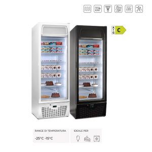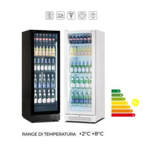 Espositore vericale SLIM a refrigerazione ventilata con temperatura in range +2C° + 8C° ; Struttura robusta, interamente in metallo interno ed esterno in lamiera d’acciaio verniciata a polvere con porta in vetrocamera temperato basso emissivo con sistema self close ed illuminazione dinamica e maniglia integrata nella cornice della porta (porta personalizzabile con logo ad illuminazione dinamica LED integrata). Isolamento eco-compatibile in schiuma poliuretanica ad alta densità. Evaporatore statico, termostato meccanico e sbrinamento automatico. In dotazione luce a LED verticale a tutta l’altezza, ripiani interni regolabili in altezza, piedini stabilizzatori e chiusura con chiave. Dimensioni interne : 300 mm x 350 mm x 1480 mm – Colore BIANCO