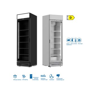 Espositore verticale a temperatura positiva + 3C° + 10C° per bevande, con capacità di 356 L.; presenta un mobile in lamiera d’acciaio con trattamento anti corrosione, evaporatore ventilato roll bond ad alta efficienza. In dotazione : luci interne verticale ed orizzontale a Led con interruttore – 5 ripiani removibili – 2 piedini regolabili . Disponibile nei colori : BIANCO e NERO.