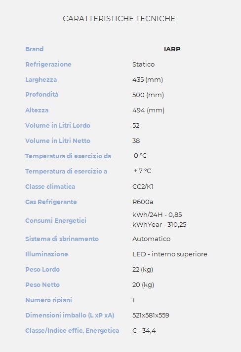 Counter Top a refrigerazione statica in range temperatura 0° C + 7° C, , con capacità di 52 Lt. Struttura interna ed esterna in lamiera d’acciaio con chiusura a porta a battente. Luce interna a Led. Un ripiano. Disponibile nei colori Grigio e Nero
