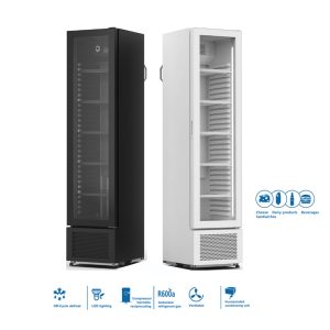 Espositore verticale ventilato congelatore range temperatura -25C° + -18C°. Ideale per prodotti da pasticceria, gelateria e alimenti surgelati, con capacità di 729 Lt. Realizzato con struttura robusta anti deterioramento e porta vetrata anti-appannamento a consumo zero. Motoventilatori ad alta efficienza, evaporatore ventilato a pacco alettato, termostato-termometro elettronico con sbrinamento automatico. 2x Luci interne verticali a Led. In dotazione 2 x 5 ripiani removibili + 2 fondo vasca, 4 piedini regolabili + 4 rullini. Disponibile nel colore : BIANCO