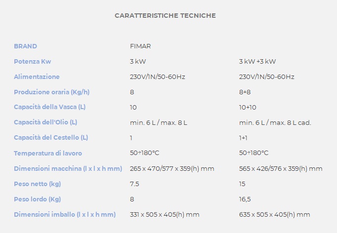 Friggitrice elettrica da banco . Struttura, vasca e coperchio in acciaio inox AISI 304- cestelli a rete estraibili in filo cromato – manici cestelli e pomelli coperchi in plastica termoisolante – resistenze inox – termostato di sicurezza con pulsante di ripristino versioni a due vasche con doppio termostato per utilizzo indipendente – testata e resistenze removibili – Raggiunge i 180C° in circa 18 minuti tempo di frittura in circa 7 minuti. Disponibile in due modelli con capacita olio da 8 Lt. FR8N con vasca singola – FR88N con doppia vasca