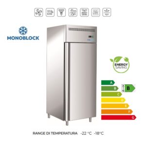 Armadio congelatore a refrigerazione ventilata in acciao INOX AISI 304 con porta a battente vetrata. Realizzato con isolamento di 60mm, pannelli esterni di fondo e schienale in lamiera galvanizzata e fondo con angoli arrotondati; evaporatore posizionato a scomparsa in modo da avere massimo spazio disponibile. Evaporatore ventilato trattato anticorrosione, termostato digitale con controllo temperatura elettronico e sbrinamento automatico a controllo elettronico della temperatura di sbrinamento, evaporazione automatica dell’acqua di condensa. Resistenza elettrica intorno alla cornice porta per eliminazione della condensa . Dotato di porta reversibile con molla di ritorno e chiusura con chiave ( guarnizione porta estraibile senza utensili ); luce interna a LED, piedini in acciaio Inox AISI 304 regolabili in altezza, 3 griglie GN2/1 + 3 coppie di guide