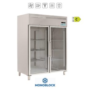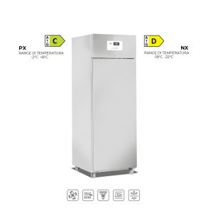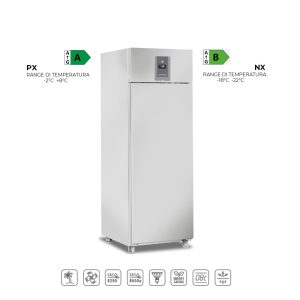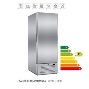 Armadio refrigerato a refrigerazione ventilata in acciao INOX AISI 304 con porta a battente vetrata. Realizzato con isolamento di 60mm, pannelli esterni di fondo e schienale in lamiera galvanizzata e fondo con angoli arrotondati; evaporatore posizionato a scomparsa in modo da avere massimo spazio disponibile. Evaporatore ventilato trattato anticorrosione, termostato digitale con controllo temperatura elettronico e sbrinamento automatico a controllo elettronico della temperatura di sbrinamento, evaporazione automatica dell’acqua di condensa. Resistenza elettrica intorno alla cornice porta per eliminazione della condensa . Dotato di porta reversibile con molla di ritorno e chiusura con chiave ( guarnizione porta estraibile senza utensili ); luce interna a LED, piedini in acciaio Inox AISI 304 regolabili in altezza, 3 griglie GN2/1 + 3 coppie di guide