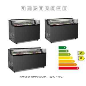 Espositore vetrina per gelato mantecato di grande affidabilità testata nel tempo, con capacità fino a 56 kg di gelato esposto (modello J9;  fino a 44 Kg. modello  J7) , con possibilità di alloggiare nel vano espositivo due piani di vaschette di h 120 mm. Struttura superiore con vetri curvi basso emissivi e ribaltina – Evaporatore statico a pacco alettato (con resistenza di sbrinamento) + serpentina schiumata nelle pareti. Luce interna orizzontale a LED. Vano riserva con sportello auto chiudente, dotato di 4 ruote pivotanti. ** (Vaschette non fornite)