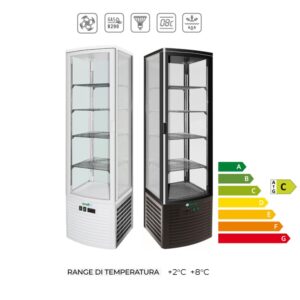 Vetrina verticale a refrigerazione ventilata, vetrata su 4 lati a temperatura negativa -18C° -22C° ;Evaporatore ventilato, termostato e controllo temperatura elettronico, sbrinamento automatico. Con ripiani vetrati in dotazione. Disponibile in due modelli con differenti dimensioni e capacità : LDC65B con capacità 280 Lt. – LDC65LB con capacità 431 Lt. Colore NERO