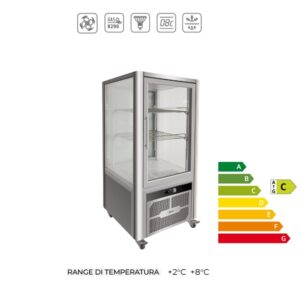 Vetrina verticale a refrigerazione ventilata, vetrata su 4 lati a temperatura positiva +2C° +8C°. Termoistato e controllo temperatura elettronico e sbrinamento automatico. Con ripiani vetrati in dotazione. Disponibile in due modelli con differenti dimensioni e capacità : LSC65B con capacità 280 Lt. – LSC65LB con capacità 431 Lt. Colore NERO