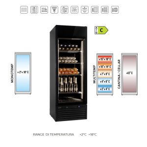 Vetrina espositiva refrigerata dedicata all’esposizione di bottiglie di vino con capacita di 386 Lt. . doppia temperatura in range + 5 C° + 12 C ° / + 12 C° + 18 C°. Refrigerazione ventilata e sistema di sbrinamento automatico. Illuminazione a LED.
