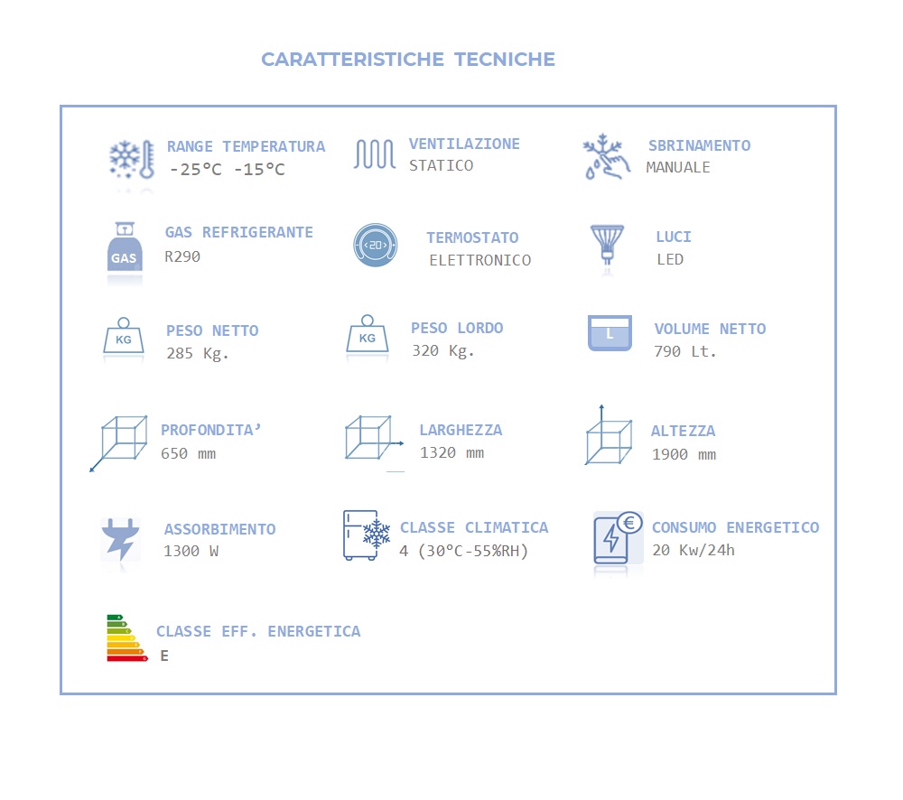 Vetrina espositiva congelatore in classe climatica 4 con range di temperatura -24° C -15° C . Ideale per ogni tipo di prodotto da pasticceria e gelateria, presenta un design elegante e raffinato. Realizzata con struttura in alluminio anodizzato color naturale, con 4 ampi lati vetrati per la massima visibilità dei prodotti esposti. 2 Evaporatori statici a 5 griglie fisse Termostato-termometro elettronico con sbrinamento manuale. Luce interna verticale a LED (x2); in dotazione 6 ruote pivotanti.