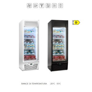 Espositore murale refrigerato ventilato con range temperatura +2C° +8C°, in classe climatica 4 – Evaporatore ventilato a Roll Bond, termostato meccanico e sbrinamento automatico. Luce interna a LED. L’ Espositore verticale SLIM è congeniale per locali con spazi ridotti, ideale per bevande e per ogni tipo di alimento fresco ; dotato di 6 ripiani espositivi facilmente personalizzabile