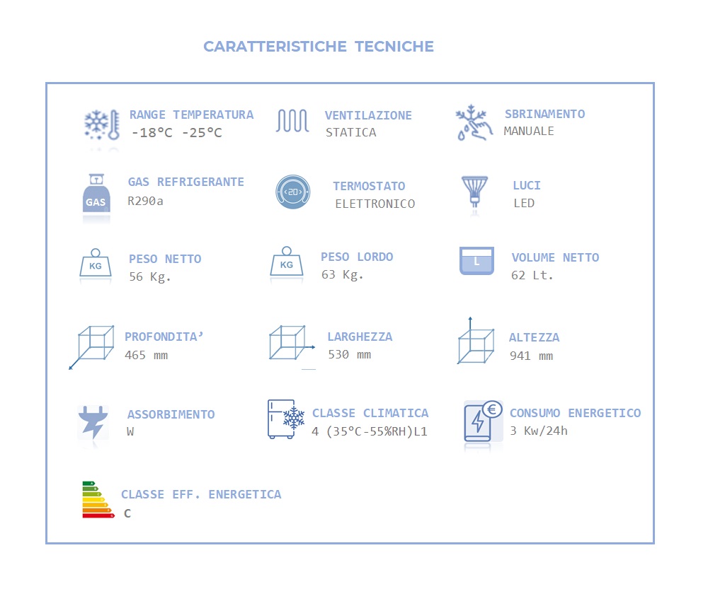 SUPER EXCITE Mini Vetrina congelatore in classe climatica 4 – temperatura in range – 18 C ° / – 25 C°. Illuminazione a LED. Evaporatore statico, termostato elettronico e sbrinamento manuale. Ideata per l’esposizione di gelati. Ideato per la vendita di “impulso” in superfici di vendita ridotte. Disponibile nei colori BIANCO e NERO