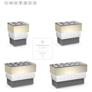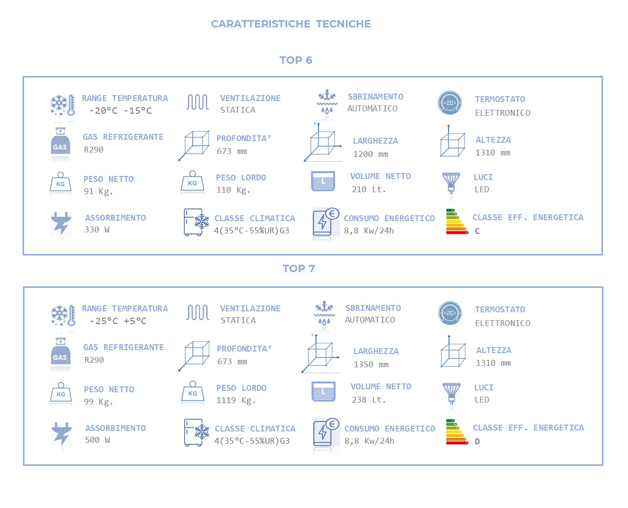 Vetrina espositore per gelato mantecato con massima capienza del vano riserva, di grande affidabilitร  con piรน di 500.000 unitร  vendute.ย  Struttura superiore con vetri piani e ribaltina Vano riserva con sportello auto-chiudente e possibilitร  di alloggiare nel vano espositivo due piani di vaschette di h 120 mm (optional). Evaporatore statico a pacco alettato (con resistenza di sbrinamento) + serpentina schiumata nelle pareti; termostato elettronico e sbrinamento automatico.ย  Dotato di luce interna orizzontale a LED e 4 ruote pivotanti. Disponibile in due diversi modelli con differenti capacitร  e dimensioni : TOP 6 210 Lt. (Netti) – TOP 7 238 Lt. (Netti)