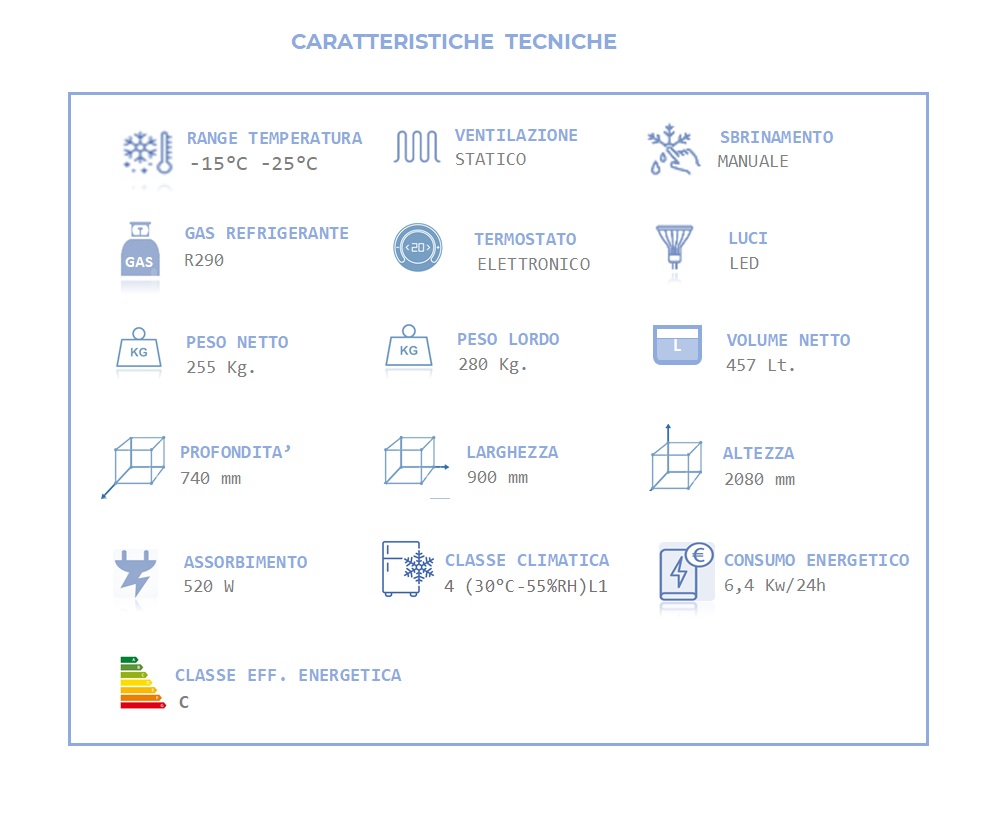 Vetrina espositiva congelatore in classe climatica 4 con range di temperatura -22° C -15° C . Ideale per ogni tipo di prodotto da pasticceria e gelateria, presenta un design elegante e raffinato, con 3 Ampi lati vetrati per una massima visibilità è realizzata con interno a specchio per esaltare il prodotto esposto. Vetro porta: vetrata isolante (3 vetri) spessore 42 mm, cornice della vetrata serigrafata basso emissivo magnetronico con film anti-appannante. Evaporatore statico a griglie fisse con cattura brina . Termostato-termometro elettronico con sbrinamento manuale . Luce interna verticale a LED (x2), in dotazione 4 ruote pivotanti + serratura. Disponibile in due varianti di colore BIANCO e NERO