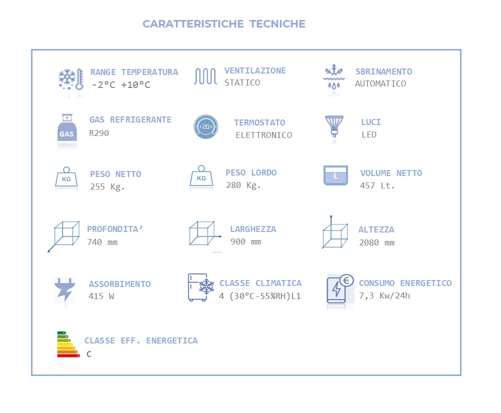 Vetrina espositiva refrigerata in classe climatica 4 con range di temperatura -2° C +10° C . Ideale per ogni tipo di prodotto da pasticceria e gelateria, presenta un design elegante e raffinato, con 3 Ampi lati vetrati per una massima visibilità è realizzata con interno a specchio per esaltare il prodotto esposto. Vetro porta: vetrata isolante (3 vetri) spessore 42 mm, cornice della vetrata serigrafata basso emissivo magnetronico con film anti-appannante. Evaporatore statico con tubo in rame e alette in alluminio con resistenze di sbrinamento . Termostato-termometro elettronico con sbrinamento automatico . Luce interna verticale a LED (x2), in dotazione 4 ruote pivotanti + serratura. Disponibile in due varianti di colore BIANCO e NERO